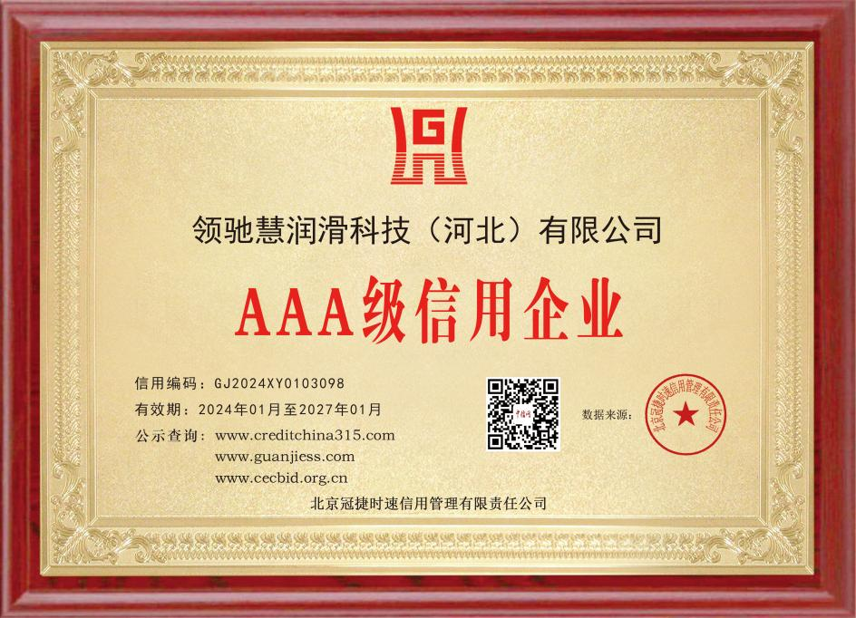 近日,領(lǐng)馳慧潤(rùn)滑科技(河北)有限公司迎來(lái)一個(gè)好消息,公司獲得了AAA信用企業(yè)認(rèn)證的榮譽(yù),此信用等級(jí)評(píng)定遵循客觀公正、科學(xué)規(guī)范的原則,對(duì)企業(yè)進(jìn)行綜合評(píng)定。